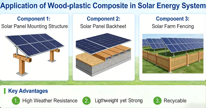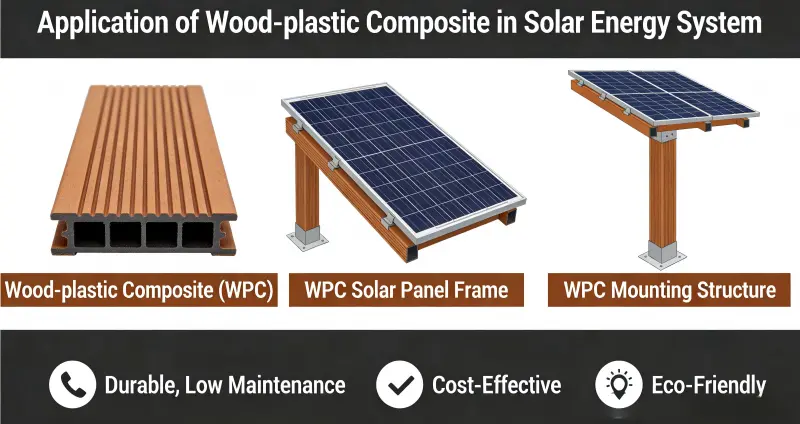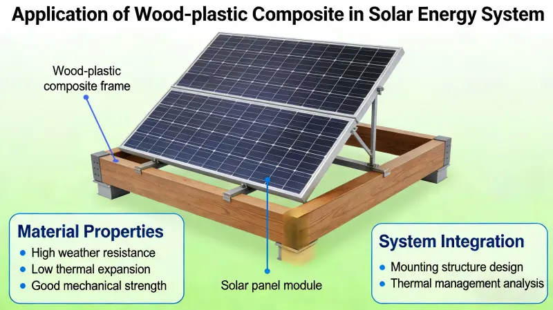 Trä-plastkomposit (WPC) har dykt upp som ett nyckelmaterial i solenergisystem, inklusive fotovoltaiska (PV) monteringar, flytande kraftverk, PV-byggnadsintegration och lagring av koncentrerad solenergi (CSP), på grund av dess miljövänliga, väderbeständiga, lätta, låga underhålls- och lättbearbetade egenskaper. Det ersätter successivt traditionella metall- och trämaterial.